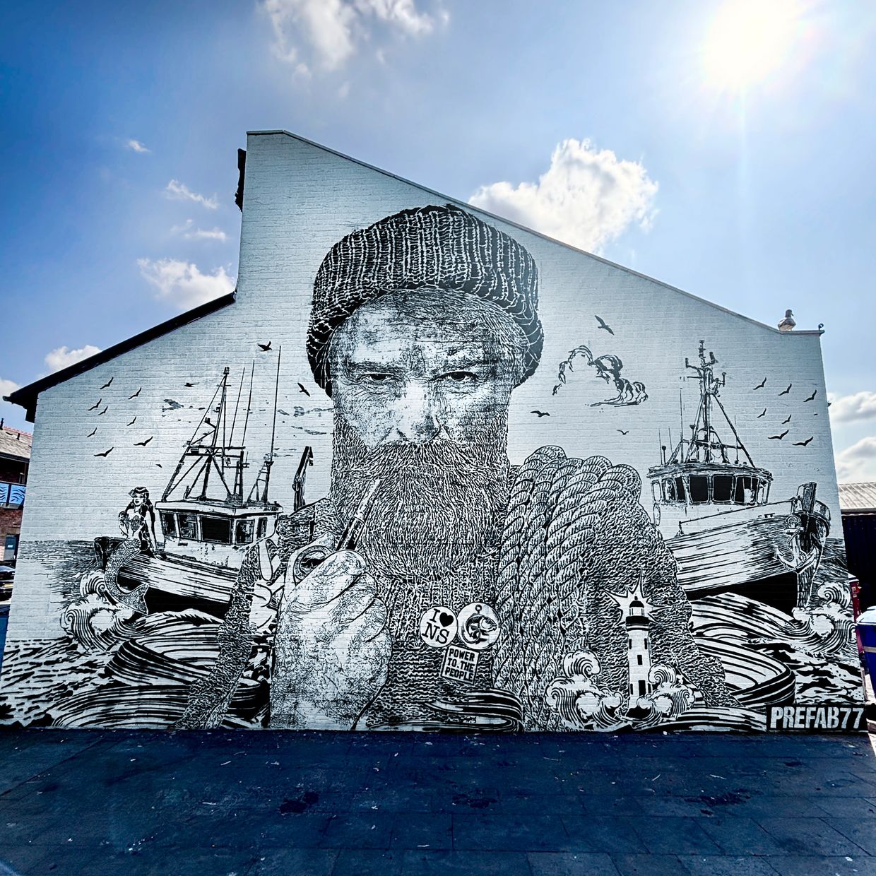 Net Worth is a dramatic representation of a fisherman, wearing a traditional 'gansey' and flanked by two small fishing vessels of the kind used by the small independent fishing crews that can be seen moored in 'The Gut' just to the rear of the building on which the mural is painted.